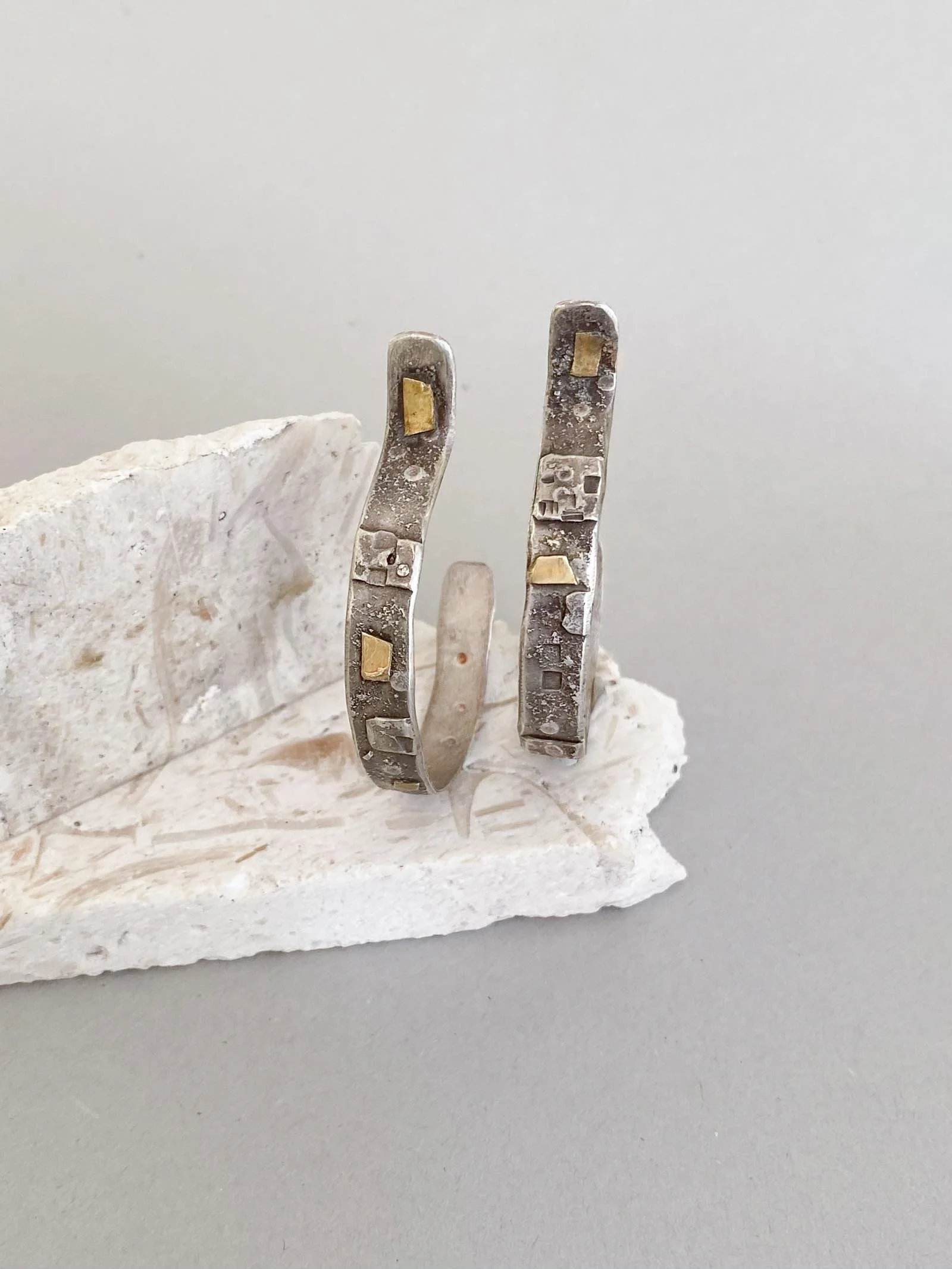 The process is slow and intentional as the flame, hammers and tools create a story buried deep within the surface layers and textures of the metal, blended together to create beautiful jewelry with the touch of the makers hand left behind.